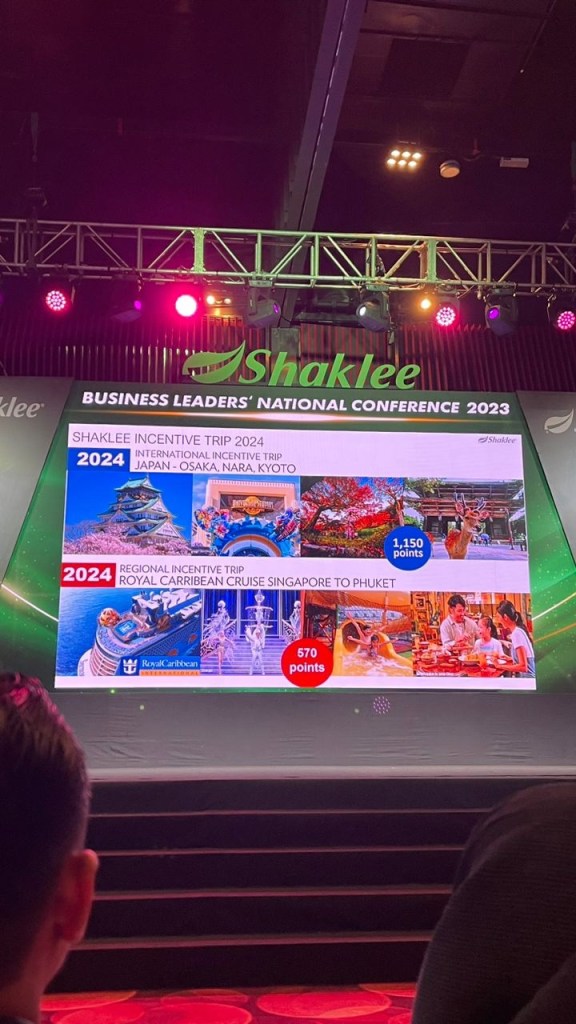 Insentif Shaklee Malaysia seterusnya adalah trip secara percuma bertaraf 5 bintang. Yang ni mami belum lagi capai. Tapi mami akan try hard lah pada cycle ni untuk sekurangnya capai 1 keping tiket local. Sebab tahun ni untuk trip local Shaklee nak bawak kita semua naik Cruise Royal Caribbean. Weh…ni baru tiket local dah mewah giler. Untuk International trip, Shaklee akan bawa ke Japan atau Umrah. Ini adalan Insentif Shaklee Malaysia untuk cycle April 2023/2024. Syok ke syok sangat.